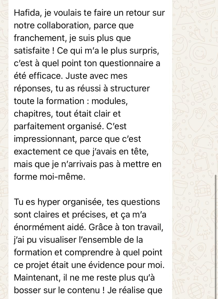 Aujourd’hui, je mets cette expertise au service des entrepreneuses ambitieuses qui veulent transmettre leur savoir à travers une formation en ligne claire, impactante et rentable.