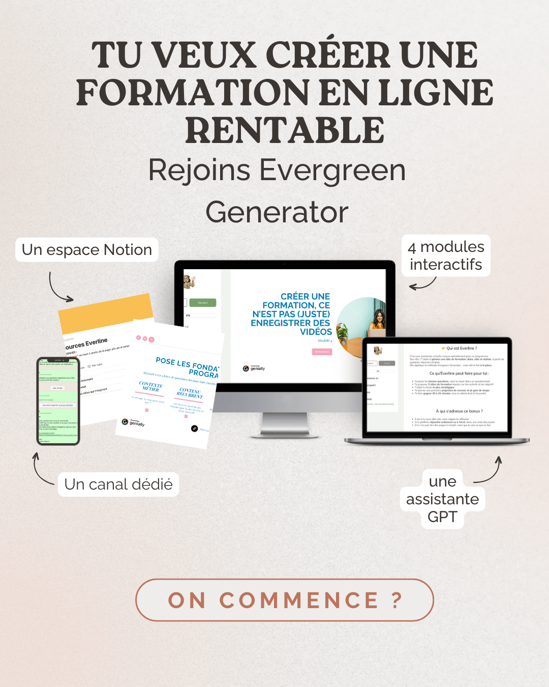 C’est de cette expérience qu’est né Evergreen Generator : un accompagnement pas à pas pour t’aider à clarifier ton idée, structurer ton contenu et lancer une offre digitale qui se vend… même quand tu es en week-end ou en vacances 🌴